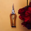 Forged by the renowned Toyama Hamono workshop, these snips are drop forged and feature a curved blade sharpened to a fine convex edge. Ideal for clean and precise cuts in soft stems and foliage, they come boxed with a black leather sheath for protection.